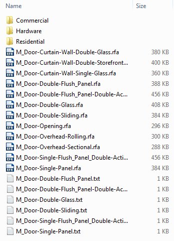The out of the box door content for the US Imperial, US Metric, and Canada Libraries have been added to from what was available in Revit 2015 and before. In 2015 there was 32 families in the Door folder, now in 2016 in the above mentioned libraries there are now 92 families. You will also notice that now there are 3 subfolders within the Door folder, Commercial, Hardware, and Residential.