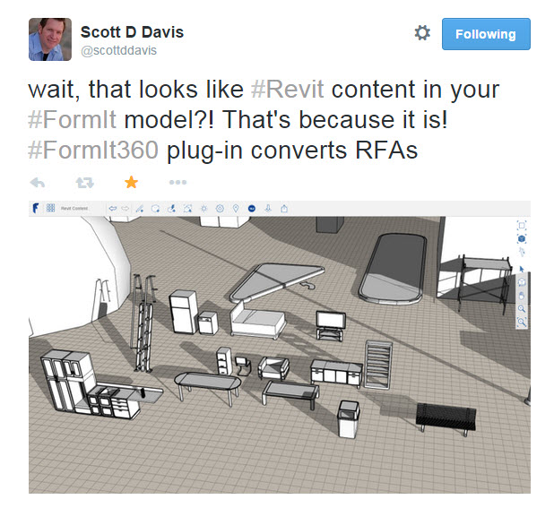 Here are a couple of Tweets from Scott Davis about the cool need Revit Add-in for FormIt 360 to allow to convert RFA’s and Sketchup Files to FormIt 360 content…….as well as begin able to convert FormIt 360 Content to RVT.