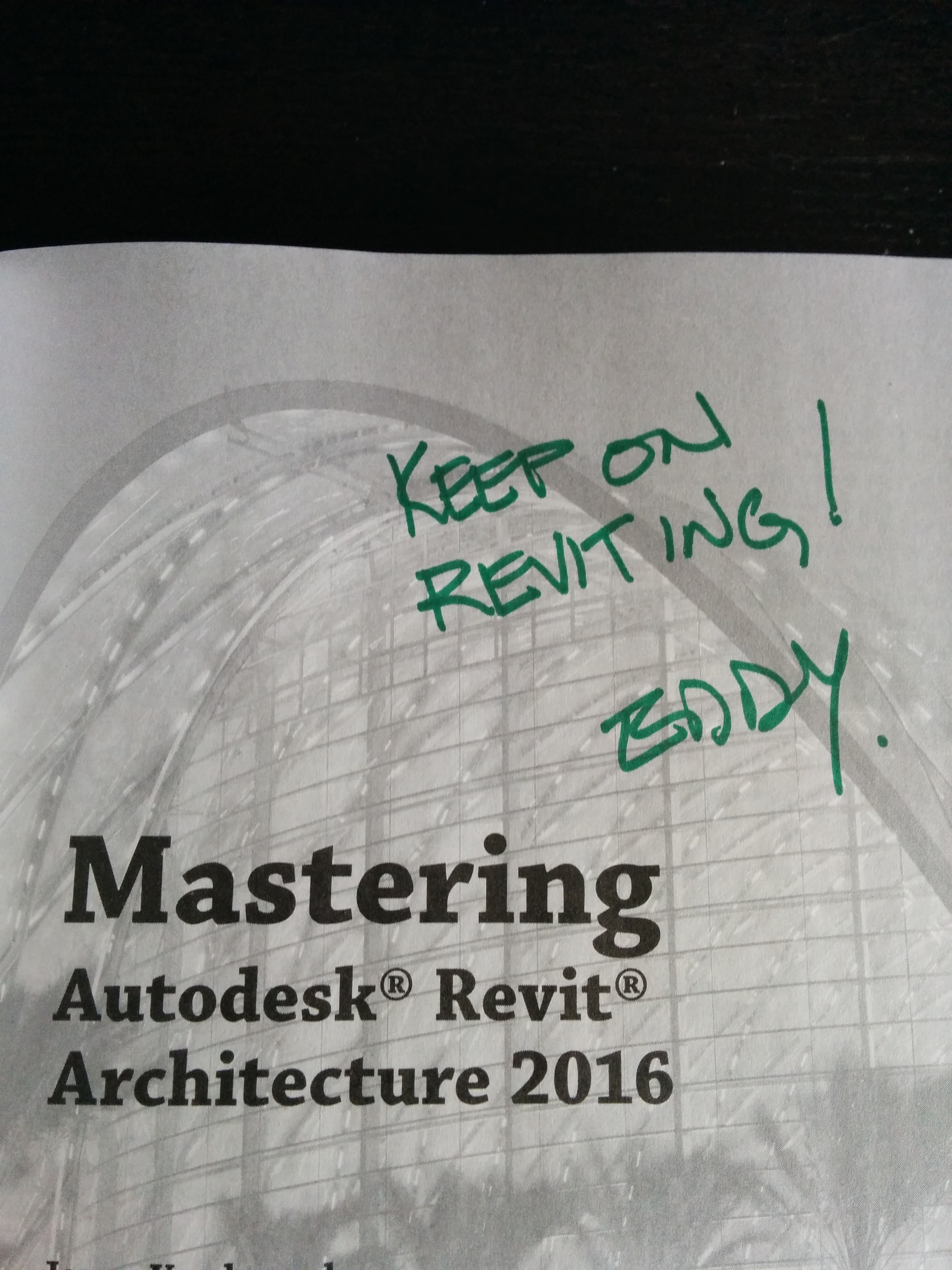 This past week I received my copy of the 2016 version of the “Master Autodesk Revit Architecture” series paperback book in the mail. While this was not something new to me, as I’ve been “collecting” them since the 2009 version, this one is special. Why you ask, well because this copy came direct to me from one of the authors, Eddy Krygiel …….and it was signed!
