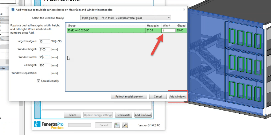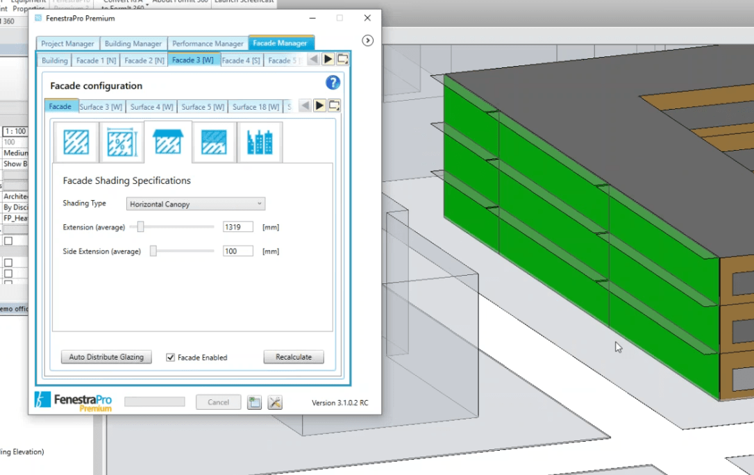 As well as adding percentage glazing to the model, the add-in can also create shading devices and write them to the Revit model.