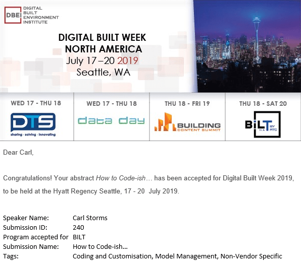Will you be attending? WIll you be speaking? Are you going to be taking part in the Hackathon? It is going to be a busy week with some much to do for all those in the AECO industry!