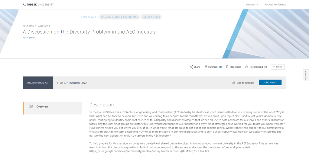 You can also catch an AU 2020 special edition of BIMThoughts being published on Nov. 17th at 9:00 am PT (12:00 pm ET) where Bill, Dana and I chat about the idea of a virtual AU, classes we would like to attend, and some of our favourite AU memories from the past!