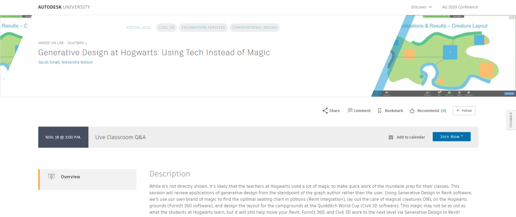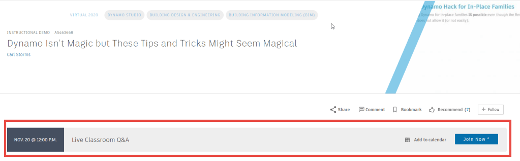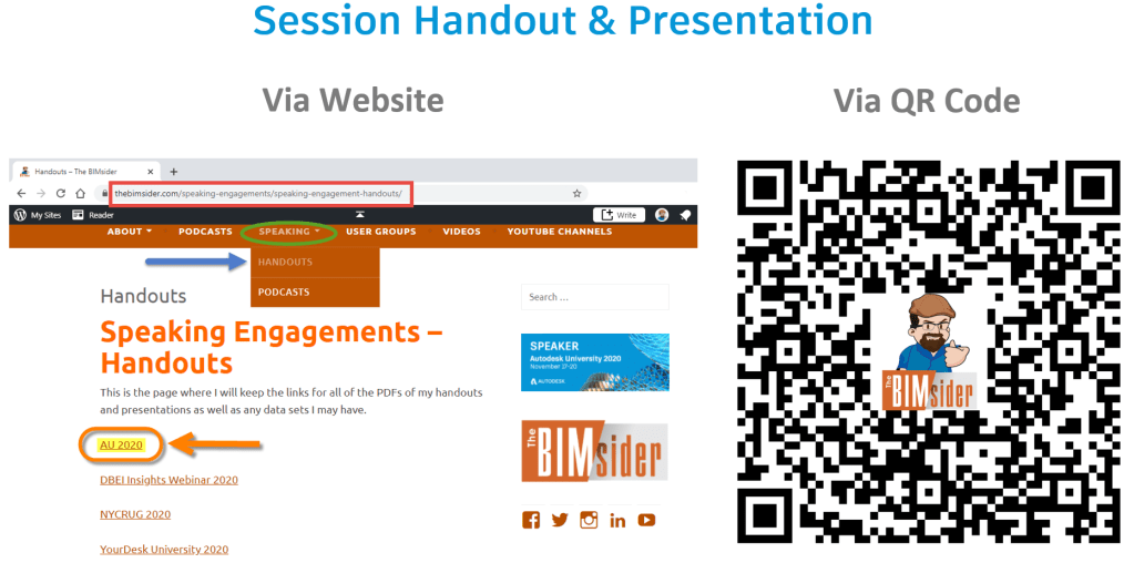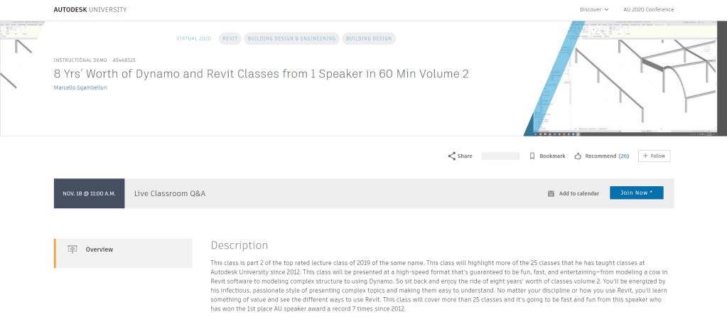 So this is where my class fits in, it will be a session on Dynamo as the title suggests “Dynamo isn’t Magic but these Tips and Tricks might seem Magical”. Because it is an instructional demo it has already been recorded and will be available for viewing by all on Tuesday, Nov. 17th at 9:00 am PT. Now you can use the AU scheduled mentioned above to find my session and bookmark it, you can also just click on the title of the session also listed above to go direct to the session page. The session page is where you will be able to find the video when it is out, as well as the class handout and presentation (again all available on the 17th of Nov.) The session content will also be available on my website, along with all my past handouts and presentations under the Speaking tab.