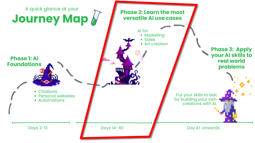 Now, let’s transition to the middle phase, Phase 2: Learning the most versatile AI use cases. If you missed it, hop over to the Phase 1 recap for some context first.