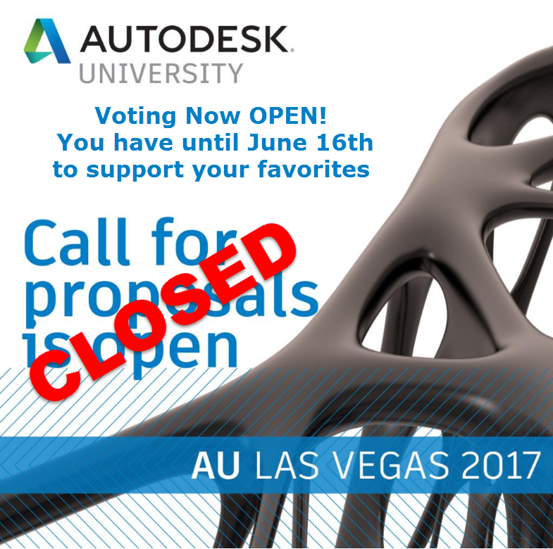 This year Autodesk University is changing things up a little when it comes to how submissions for AU 2017 are selected. This year they are publishing all 2,257 abstracts that got submitted on or before the May 17th deadline. You can head over the Autodesk University Website to review all submissions and vote for the ones you like here.